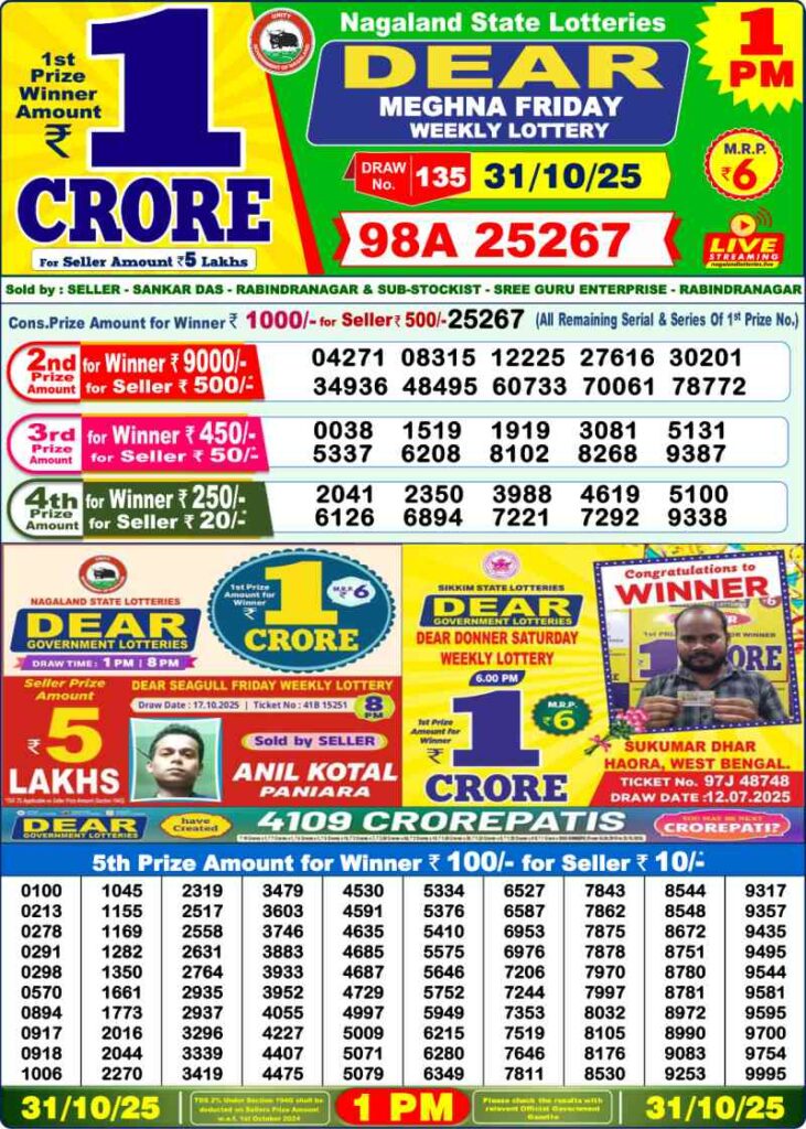 Are you searching for lottery player Lottery Results Today, then you are here you can get the Lottery Sambad Result Today 31.10.2025 live, at 1 PM, 6 PM, and 8 PM. Here you can download lottery sambad today result, lottery sambad live draw, lottery sambad result, sikkim lottery sambad result, nagaland lottery sambad result published lottery result 31.10.2025 Lottery Sambad Result, Sikkim Lottery Sambad 01:00 PM Result, Lottery Sambad 6 PM Result, Lottery Sambad 8 PM Result, Sikkim State Lottery Result, Nagaland State Lottery Result, Dear Lottery Sambad Morning Draw List, Lottery Sambad Evening Draw List , lottery sambad night draw list, lottery sambad 31.10.2025 live result, dear lottery result published below in jpg format.